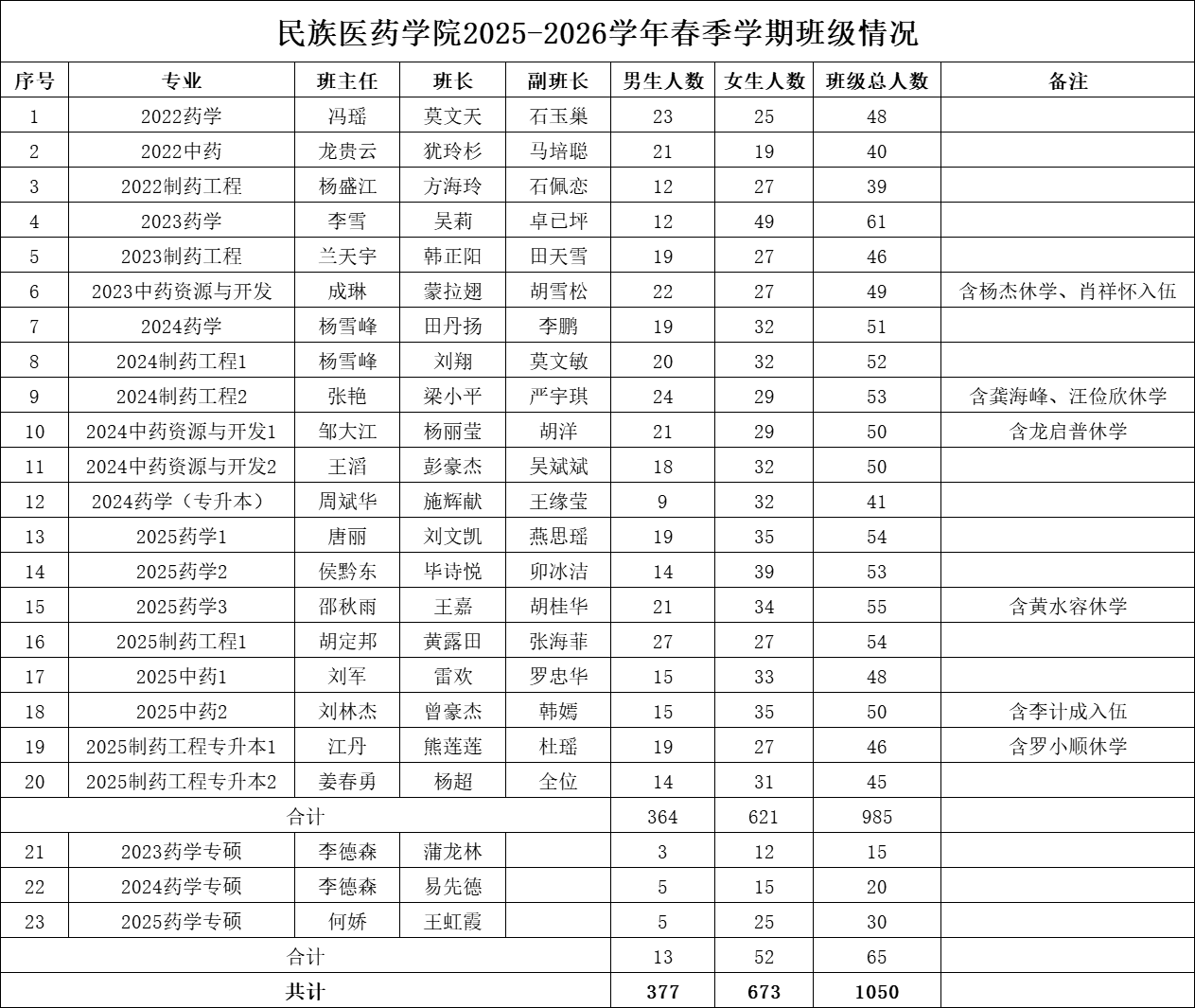 民族医药学院2025-2026学年春季学期班级情况